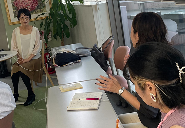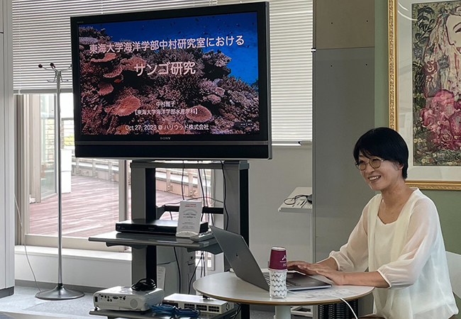 サンゴをはじめとした底生生物群集に関する生態学域研究が専門の中村雅子先生は、地球とサンゴにやさしい日焼け止め『feel coral サンプロテクト ミルク』を開発したハリウッド株式会社本社で、スタッフ向けにサンゴの生態の現状と課題をお話ししてくださいました。当日は会社役員、研究開発スタッフだけでなく、販売流通に関わるスタッフまで参加し、質疑も活発なセッションとなりました。
