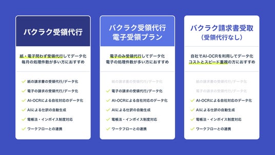 「バクラク受領代行」では、お客様の請求書受領状況に応じて複数のプランをご用意しています。