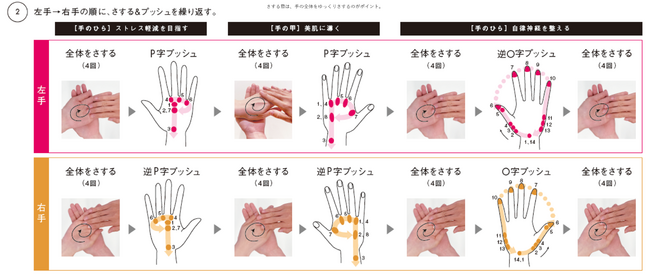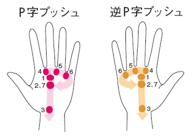 [1]手のひらに「P」を描きながら押し、炎症を鎮めて解毒を促し、リンパと血液を整える