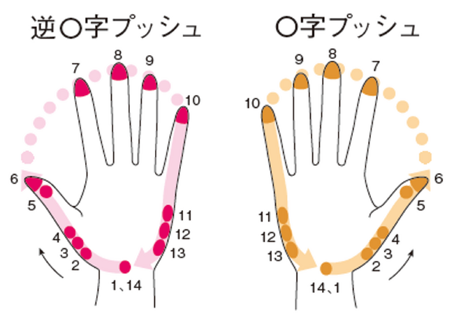 [3]手のひらの外周を「O」を描きながら押し、自律神経や脳を癒して、目や耳鼻、関節の疲労をのぞく