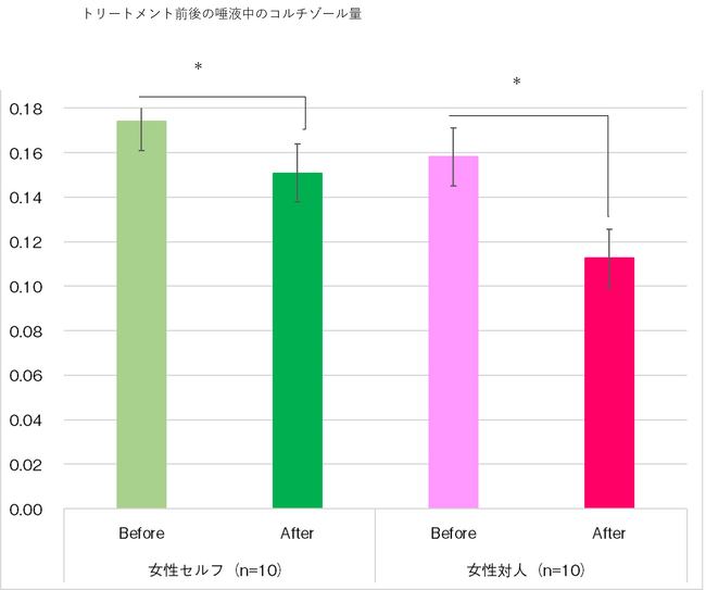 1.セルフでも対人でも、トリートメント後には、ストレスホルモン「コルチゾール」量が有意に低下した。
