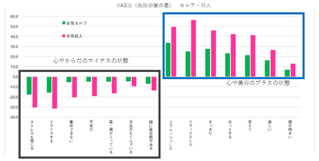 2.セルフでも対人でも、トリートメント後には、心身の状態を示すマイナス項目は減少し、プラス項目は増加する傾向が得られた。セルフよりも対人の方が、マイナス項目の減少率、プラス項目の増加率が大きい傾向が得られた。