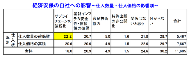 帝国データバンクが2022年4月に実施した調査において、原材料高や円安、ロシア・ウクライナ情勢の影響等を受けて、仕入数量の確保難および仕入価格の高騰に直面していると回答した企業[3]と、今回の経済安保との関係をみると、「仕入数量の確保難」に直面している企業において、「SCの強靱化」(22.2%)をあげる企業が全体を4.2ポイント上回った。