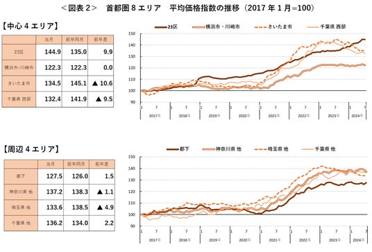 エリア別の前月比は、上昇エリアが東京都下のみとなったほか、神奈川県他と千葉県西部では1%を超える下落幅となっており、全体的に下落が目立つ月となった。中でも、埼玉県他の下落は7カ月連続と最も長くなっている。