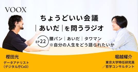 堀越耀介氏(東京大学特任研究員/哲学対話)と樫田光氏(デジタル庁/データ分析)。異なる専門性を持つ二人が世の中の様々な「白か黒か、どちらか一方に割り切れない物事」=“あいだ”について語り合います。何かと何かの“あいだ”を切り口に問いを進めることで予測不能な化学反応を生み出し、聴く人に新たな気づきを与えてくれる。そんな"ちょうどいい"を探求する二人のクロストークをお楽しみください。