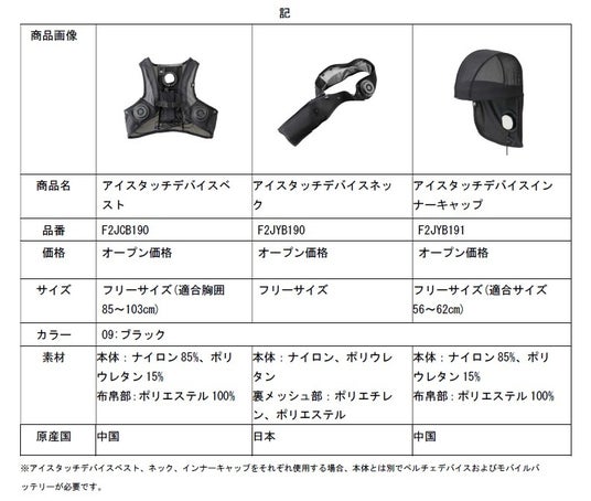 ※1 熱中症資料(環境省https://www.wbgt.env.go.jp/pdf/R05_heatillness_report_23.pdf)今回発売する「アイスタッチデバイスベスト」は、電流を流すと冷却するペルチェ素子※2のデバイスを搭載し、ポイント冷却で効率的なクーリングが可能なワークウエアです。「アイスタッチデバイスベスト」および関連商品の「アイスタッチデバイスネック」、「アイスタッチデバイスインナーキャップ」の販売目標はシリーズ合計で1,200枚です(発売から1年間)。