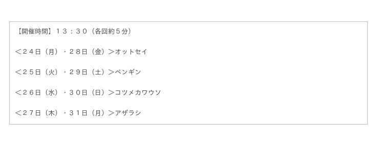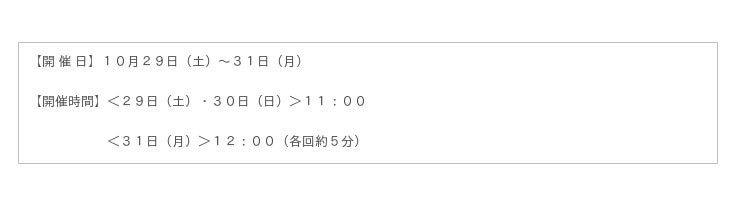 【開催時間】11:30/13:00/14:30/16:00(各回約15分)