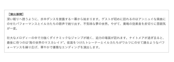 暗転した会場を美しく妖艶に染めるライティングやウォーターカーテン・噴水などの水の演出を駆使した舞台でイルカたちがダイナミックなパフォーマンスを展開。さらにMCを入れず、場面転換のみで進行することにより、ゲストをより深く圧倒的な世界観へと引き込みます。