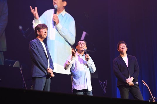 <さだまさしさんとともに、ジャパネットホールディングス代表取締役社長 兼 CEO 高田旭人、株式会社A and Live 代表取締役 高田明がステージでトーク>
