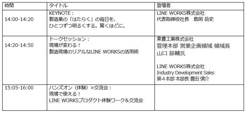ビジネスコミュニケーションツール「LINE WORKS」や各種AI製品を提供するLINE WORKS株式会社(本社:東京都渋谷区、代表取締役社長:島岡 岳史)は、11月25日(火)に名古屋テレビにて、製造現場で働く方々を対象とした体験型イベント「LINE WORKS HANDS ON TOUR」を初開催いたします。参加費は無料、エントリーを受け付ける特設サイトを公開しました。