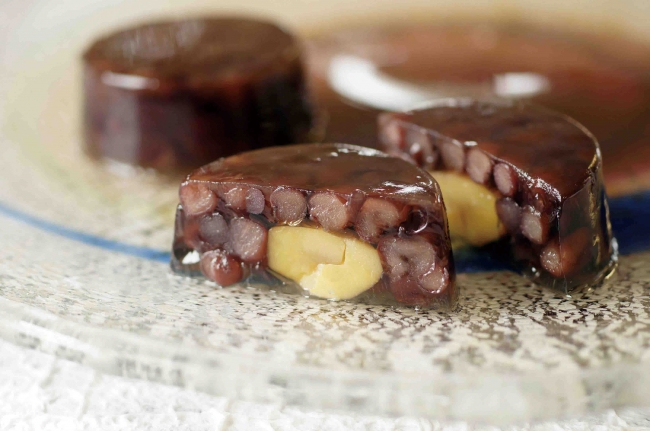 ↑丹波栗と丹波大納言小豆を寒天で包んだ素材の味わいをお楽しみください。