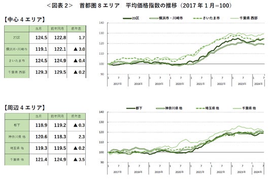 エリア別の前月比は、さいたま市が+1.0%、千葉県他が-1.0%とやや大きな動きとなったものの、8エリア全体では2023年以降小幅に推移している。