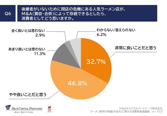 「Q6. 後継者がいないために閉店の危機にある人気ラーメン店が、M&A(買収・合併)によって存続できるとしたら、消費者としてどう思いますか。」(n=513)と質問したところ、「非常に良いことだと思う」が32.7%、「やや良いことだと思う」が46.8%という回答となりました。