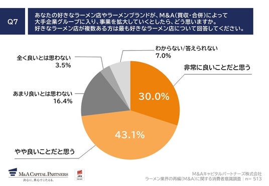 「Q7. あなたの好きなラーメン店やラーメンブランドが、M&A(買収・合併)によって大手企業グループに入り、事業を拡大していくとしたら、どう思いますか。好きなラーメン店が複数ある方は最も好きなラーメン店について回答してください。」(n=513)と質問したところ、「非常に良いことだと思う」が30.0%、「やや良いことだと思う」が43.1%という回答となりました。。