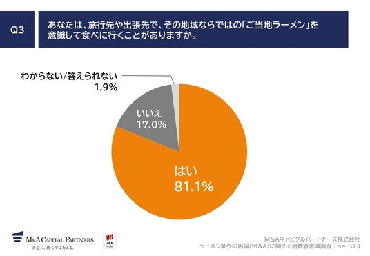 「Q3. あなたは、旅行先や出張先で、その地域ならではの「ご当地ラーメン」を意識して食べに行くことがありますか。」(n=513)と質問したところ、「はい」が81.1%、「いいえ」が17.0%という回答となりました。