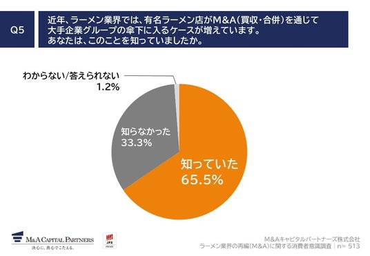 「Q5. 近年、ラーメン業界では、有名ラーメン店がM&A(買収・合併)を通じて大手企業グループの傘下に入るケースが増えています。あなたは、このことを知っていましたか。」(n=513)と質問したところ、「知っていた」が65.5%、「知らなかった」が33.3%という回答となりました。