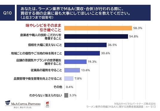 「Q10. あなたは、ラーメン業界でM&A(買収・合併)が行われる際に、買収する側の企業に最も大事にしてほしいことを教えてください。(上位3つまで回答可)」(n=513)と質問したところ、「味やレシピをそのまま引き継ぐこと」が58.3%、「創業者や職人の技術・こだわりを尊重すること」が54.8%、「価格を大幅に変えないこと」が36.5%という回答となりました。
