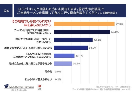 「Q4. Q3で「はい」と回答した方にお聞きします。旅行先や出張先でご当地ラーメンを意識して食べに行く理由を教えてください。(複数回答)」(n=416)と質問したところ、「その地域でしか食べられない味を楽しみたいから」が67.8%、「ラーメンは地域ごとに特色があり、食べ比べが楽しいから」が63.0%、「旅行や出張の楽しみの一つとして外せないから」が43.3%という回答となりました。