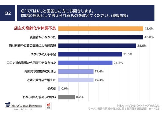 「Q2. Q1で「はい」と回答した方にお聞きします。閉店の原因として考えられるものを教えてください。(複数回答)」(n=426)と質問したところ、「店主の高齢化や体調不良」が42.0%、「後継者がいなかった」が42.0%、「原材料費や家賃の高騰による経営難」が38.5%という回答となりました。