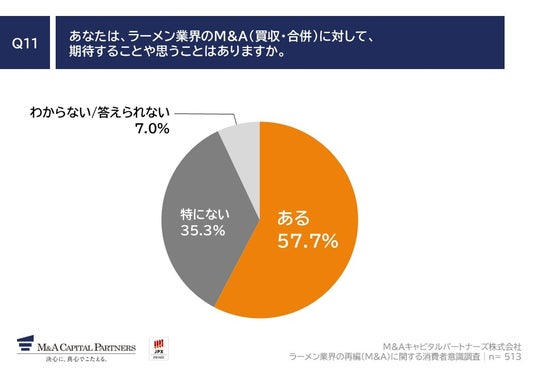 「Q11. あなたは、ラーメン業界のM&A(買収・合併)に対して、期待することや思うことはありますか。」(n=513)と質問したところ、「ある」が57.7%、「特にない」が35.3%という回答となりました。
