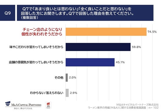 「Q9. Q7で「あまり良いとは思わない」「全く良いことだと思わない」を回答した方にお聞きします。Q7で回答した理由を教えてください。(複数回答)」(n=102)と質問したところ、「チェーン店のようになり個性が失われそうだから」が74.5%、「味やこだわりが変わってしまいそうだから」が59.8%、「店舗の雰囲気が変わってしまいそうだから」が45.1%という回答となりました。