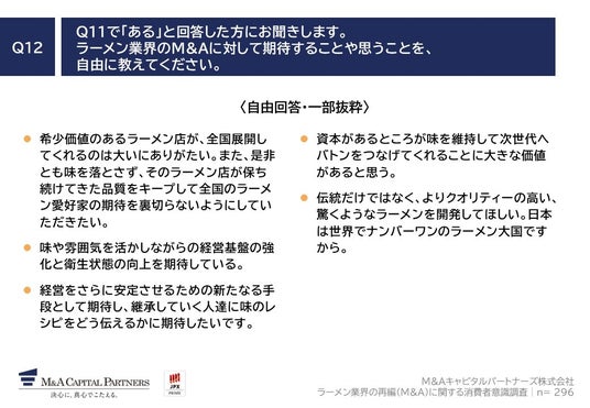 「Q12. Q11で「ある」と回答した方にお聞きします。ラーメン業界のM&Aに対して期待することや思うことを、自由に教えてください。」(n=296)と質問したところ、175の回答を得ることができました。