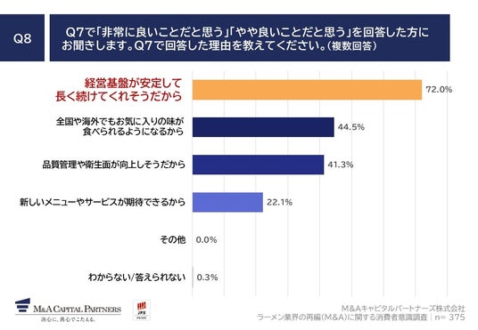 「Q8. Q7で「非常に良いことだと思う」「やや良いことだと思う」を回答した方にお聞きします。Q7で回答した理由を教えてください。(複数回答)」(n=375)と質問したところ、「経営基盤が安定して長く続けてくれそうだから」が72.0%、「全国や海外でもお気に入りの味が食べられるようになるから」が44.5%、「品質管理や衛生面が向上しそうだから」が41.3%という回答となりました。