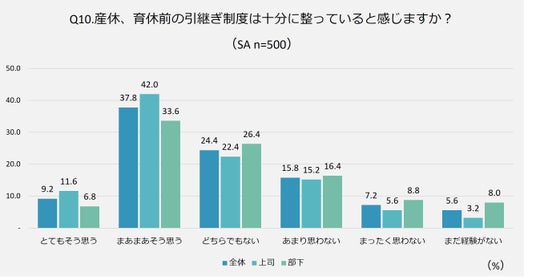 「Q10:産休、育休前の引継ぎ制度は十分に整っていると感じますか?」という質問では、上司は「とてもそう思う」・「そう思う」が53.6%に対し、育休対象者は「とてもそう思う」・「そう思う」が40.4%と13ポイントの差があることがわかりました。