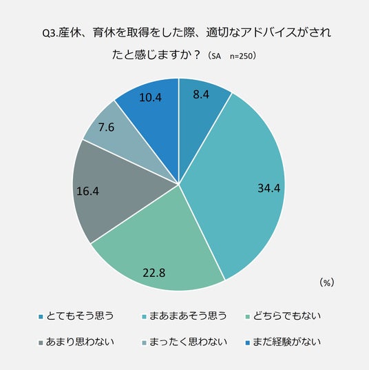 また、育休対象者側に「Q3:産休・育休を取得した際、適切なアドバイスがされたと感じますか?」と質問したところ、「とてもそう思う」・「そう思う」と回答したのは42.8%。「とてもそう思う」と回答したのは8.4%と1割に満たない結果となりました。