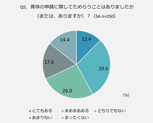 「Q4:産休・育休取得で特に不安に感じる(または、感じた)ことはなんですか?」という質問で、最も多いのは、「給与の減少(44.4%)」。次いで「復帰後のキャリア(34.8%)」、「引継ぎ相手の負担(32.4%)」という結果に。また、「Q5:育休の申請に関してためらうことはありましたか(または、ありますか)?」という質問では、42.0%が「ある」と回答しています。