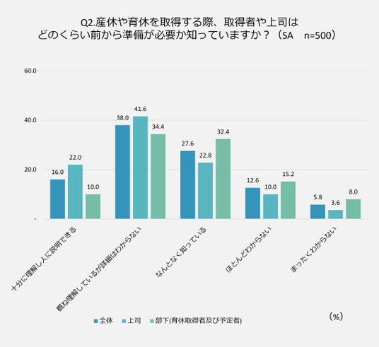 「Q2:産休や育休を取得する際、取得者や上司はどのくらい前から準備が必要か知っていますか?」という質問では、全体の54.0%が「十分に理解し人に説明できる」、「概ね理解しているが詳細はわからない」と回答している一方、「十分に理解し人に説明できる」と回答した育休対象者はわずか10.0%となりました。また、上司側も、「十分に理解し人に説明できる」と回答したのは22.0%と低く、育休対象者・上司ともに、産休・育休の具体的な準備に関する理解促進についての課題が浮き彫りとなりました。