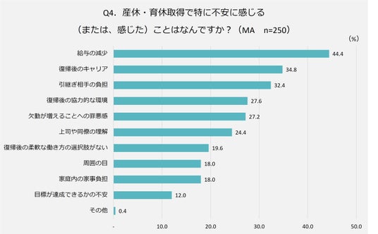 育休取得で不安に感じること「給与の減少」が多数。次いで「復帰後のキャリア」、「引継ぎ相手の負担」。
