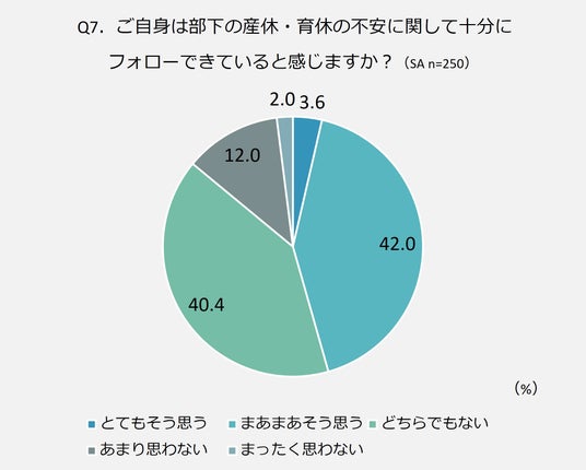 「Q7:ご自身は部下の産休・育休の不安に関して十分にフォローできていると感じますか?」という問いでは、45.6%が「とてもそう思う」・「そう思う」と回答しました。