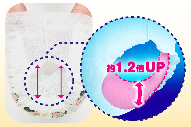 新発売の「グーン12時間ぐんぐん吸収パンツ」は、おしっこをたっぷり吸収する「6回分の吸収パワー」で、長時間繰り返しおしっこしてもモレずに安心な仕様です。また、足まわりのギャザーを当社通常品※6の約1.2倍の高さに改良した「グーン史上最高(さいたか)ギャザー」と、うつぶせ寝でもおしっこをすばやく吸収して拡散する「スピード吸収シート」で、昼も夜も安心してお使いいただけます。