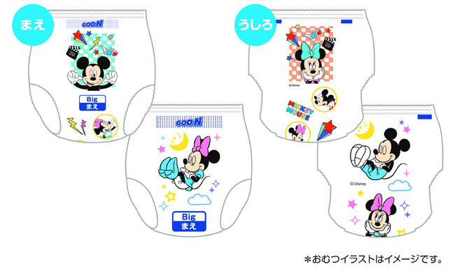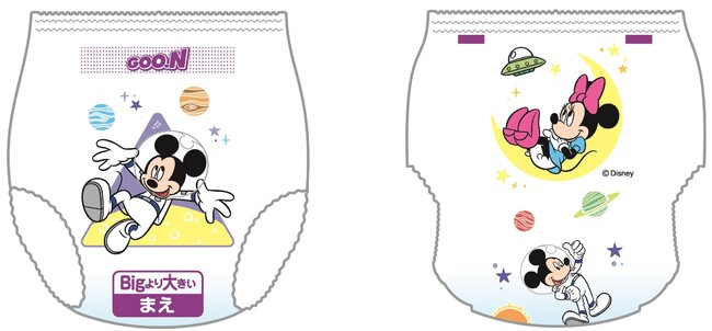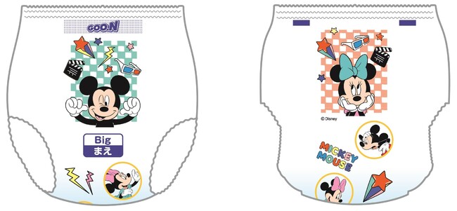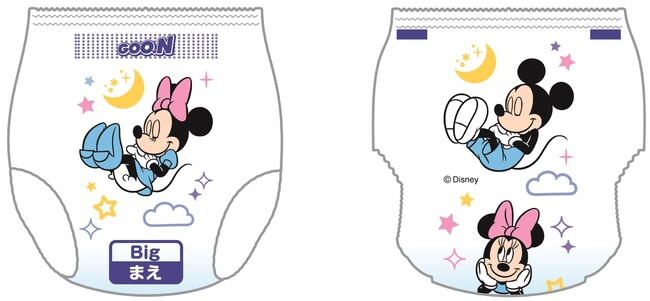 パッケージとおむつ柄には、“ミッキーマウス”と“ミニーマウス”が描かれた人気のディズニーデザインを採用。1パックに2種(昼と夜のデザイン)のおむつ柄が入っており、昼と夜で気分を変えながらおむつ替えをお楽しみいただけます。