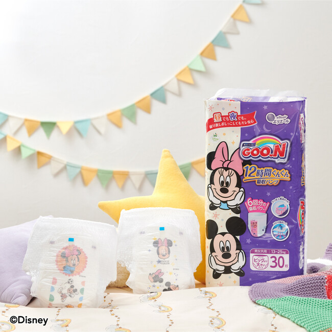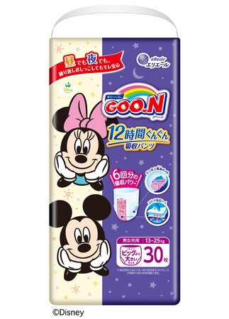 そこで、ベビー用紙おむつブランド「グーン」から、昼も夜も安心できるパンツタイプの紙おむつ「グーン12時間ぐんぐん吸収パンツ」を発売します。生活者の「長時間使用時のモレが不安」や「昼と夜で紙おむつを使い分けることが手間」といったお悩みに応え、忙しい子育て世代の毎日に寄り添ってまいります。
