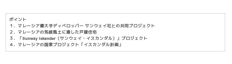 そのため、プレハブ住宅のノウハウと技術を持つ当社と、マレーシアの住宅市場で確固たる地位を築いているサンウェイ社との提携による今回の戸建住宅事業は、マレーシアにおいてプレハブ住宅を展開していく上での重要な足がかりとなります。