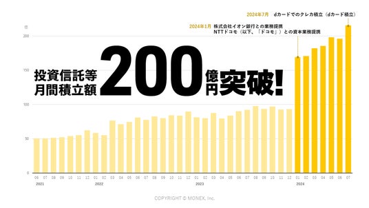 マネックス証券株式会社(本社:東京都港区、取締役社長執行役員:清明祐子、以下「マネックス証券」)は、2024年7月の投資信託の月間積立額(※1)が200億円を突破したことをお知らせいたします。