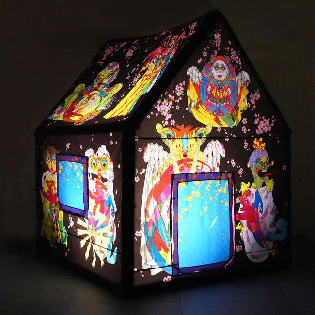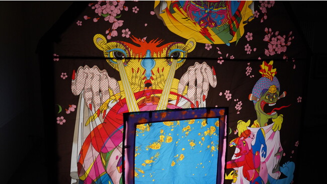 屏風もテントも、折り畳んでコンパクトに収納でき、移動や展示が容易に行えるものです。ポップでエネルギッシュな作品の魅力と、様々な空間で鑑賞~体験する、田名網流の新しい「お茶会」の可能性を感じていただければ幸いです。