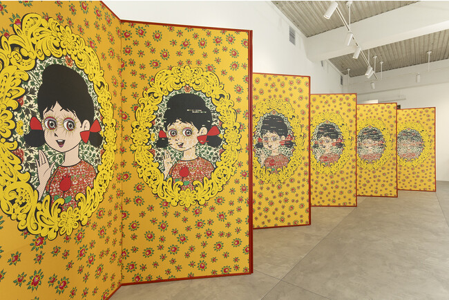 本展では、ニューヨークで公開された屏風作品、五曲一双を展示。またグラビアプリント作品のミスプリントをコラージュした屏風の他、全面に絵をプリントしたオリジナルの「茶室テント」作品も初公開します。FLOWS INC.の空気で膨らむエアフレームテントは、おもちゃの家のような軽やかさを持っています。
