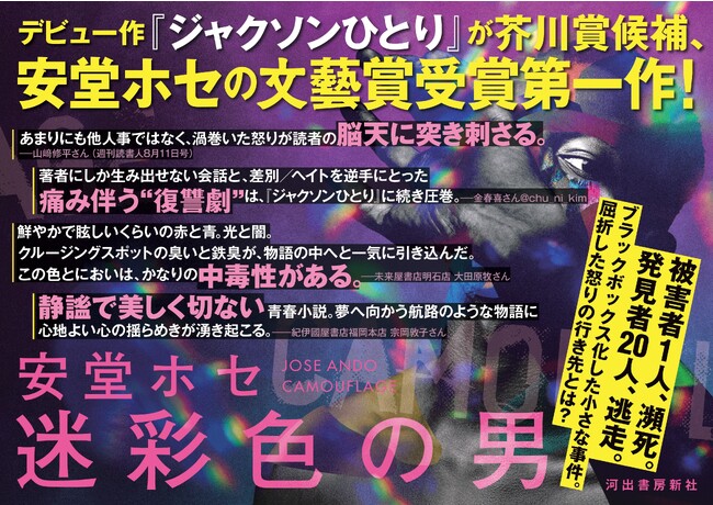 昨年、第59回文藝賞を受賞したデビュー作『ジャクソンひとり』が第168回芥川龍之介賞候補となり、今最も注目を集める作家・安堂ホセによる第二作『迷彩色の男』が2023年9月27日に発売されました。本作は9月29日に発表された第45回野間文芸新人賞(野間文化財団主催)の候補作品に選ばれ、更なる熱い視線が注がれています。