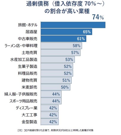 最も割合高い業種は「旅館・ホテル」の74%、業績厳しいB to C業種が上位に