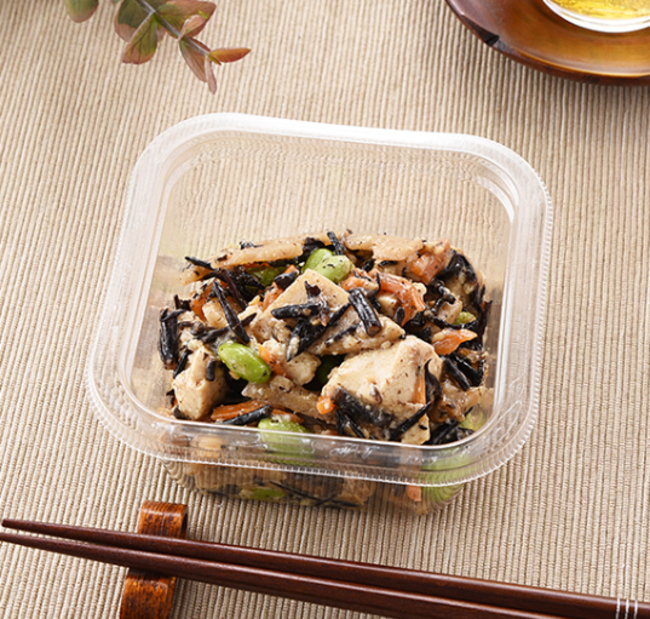 【特徴】お豆腐や枝豆、れんこん、油揚げの入ったひじき煮。濃口醤油・本みりん・三温糖に、旨みのある八方だしを使用した、風味豊かな和風のお惣菜です。