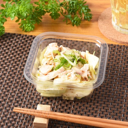 【内容】ローストしたネギの風味が味わえるおつまみ惣菜。にんにくを効かせた塩だれで和えた鶏むね肉・キャベツ・紫玉 ねぎが、ビール・お酒のお供によく合います。