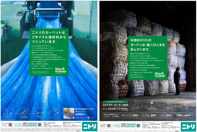 これらの取り組みを多くの方々に知っていただくことを目的として、2022年よりシリーズ広告を掲載。今年度は、より臨場感をもってお伝えすることを目指し「ニトリのサステナブルな現場」をテーマに作成しました。「リサイクル原材料を使用したカーペット製造」では、タイの自社工場サイアムニトリの製造現場を、「カーテンのリサイクル回収の取り組み」では、お客様から回収したカーテンの集約現場を撮影・掲載しました。