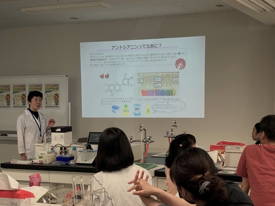 講師は一関高専 化学・バイオ系の中川裕子教授が務め、女性教職員および女子学生団体「STEAM-nitic」のメンバーがアシスタントを務めました。アントシアニンの吸光度スペクトルが酸性・中性・塩基性の環境でどのように変化するかについて、実際に分析装置を使用しながら解説し、その後に参加者のグループごとに次の3種類のカップケーキを作成しました。