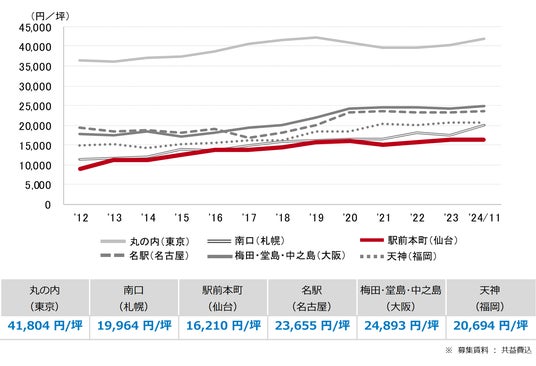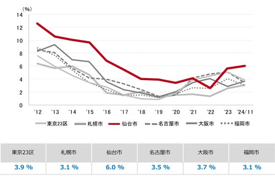 三幸エステート株式会社(本社:東京都中央区、取締役社長:武井重夫)は、2024年11月度の仙台市オフィス賃貸状況(空室率&現空面積:全規模、募集賃料&募集面積:全規模、規模別空室率、主要エリア※1空室率:全規模)および全国6大都市(東京・札幌・仙台・名古屋・大阪・福岡)の大規模ビルのマーケットデータをまとめた「オフィスマーケット2024年12月号仙台」を公表します。