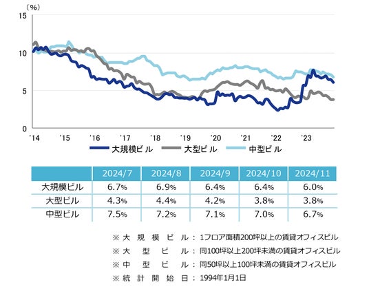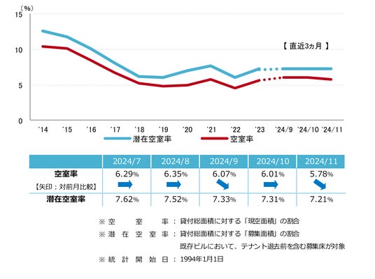 空室率は前月比マイナス0.23ポイントの5.78%と3ヵ月連続で低下し、2023年12月以来の5%台となった。主要エリアの大規模ビルを中心に、建替えに伴う移転や館内増床等で空室床の消化が進み、主な低下要因となっている。潜在空室率は前月比マイナス0.10ポイントの7.21%だった。