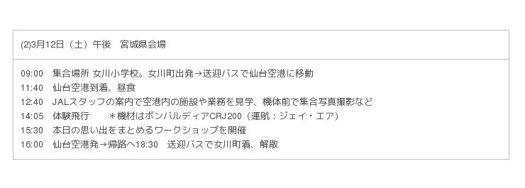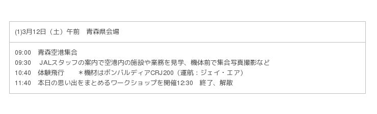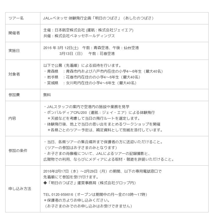 日本航空株式会社(本社:東京都品川区、代表取締役社長:植木 義晴、以下「JAL」) と株式会社ベネッセホールディングス(本社:岡山県岡山市、代表取締役社長:原田 泳幸、以下「ベネッセ」)は、青森空港・花巻空港・仙台空港で、各県内在住の小学生(4~6年生)最大40名を対象にした、空港内でのJALのお仕事見学と、チャーター便による各県内外の体験飛行を組み合わせた1日ツアー(3月12日(土)、13日(日)開催)へ招待します。