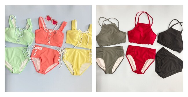 夏らしいシャーベットカラーがキュートなリボンデザインの水着と、控えめなフリルが大人かわいくセクシーなホルターネックタイプの水着を全6種展開します。気になるお腹周りをカバーしてくれるハイウエスト仕様のため、安心して着用いただけます。水着一着を2,000円台というプチプラで購入でき、毎年トレンドに合わせて水着を買い替えたいという、ファッションに敏感な学生のニーズに応えた商品です。